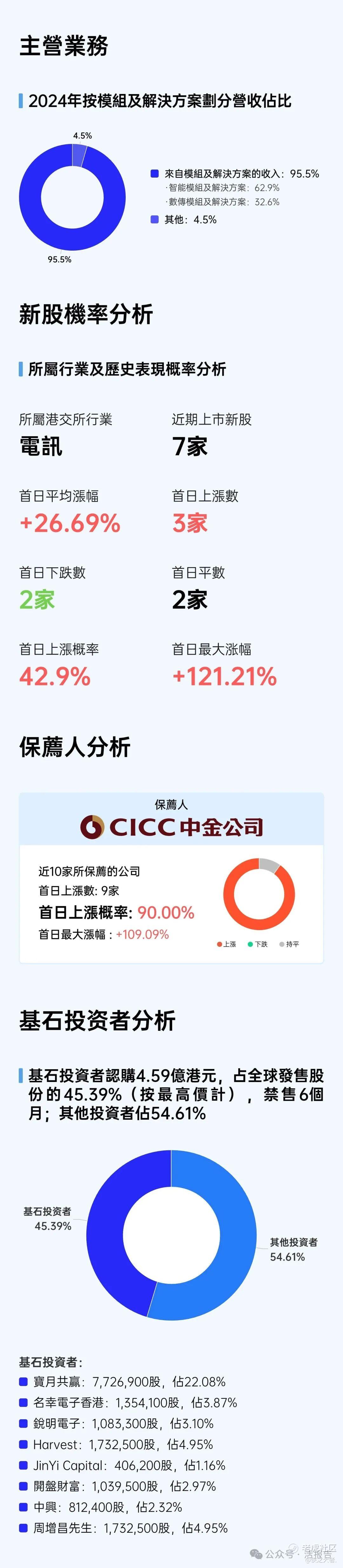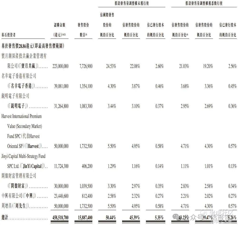 本次发行以机制B分配,公开发售占10%,无强制回拨。国配引入8家基石投资者(宝月共赢、名幸电子香港、锐明电子、Harvest、JinYi Capital、开盘财富、中兴、周增昌先生),认购约4.59亿港元,占全球发售股份的45.39%。