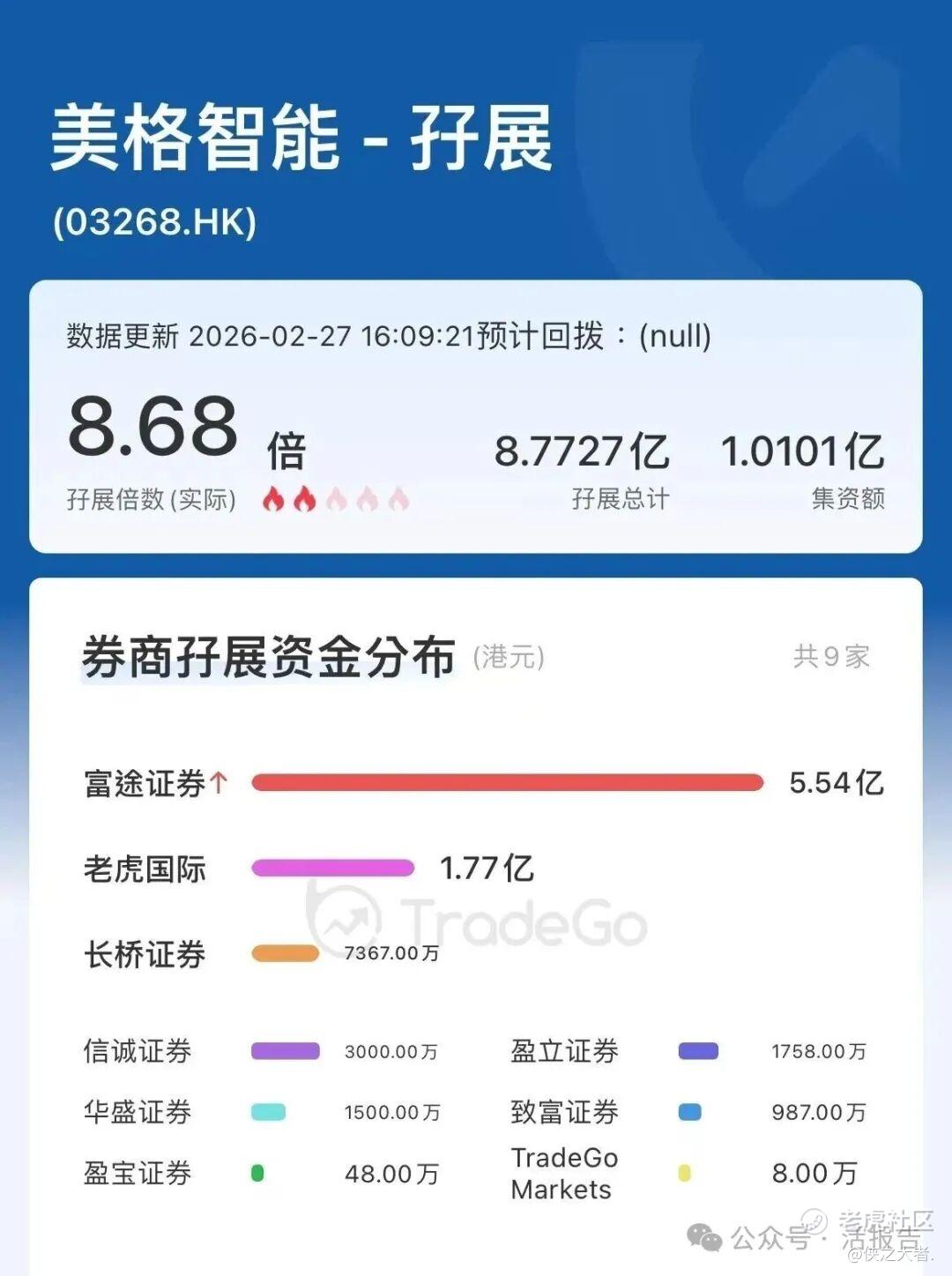据TradeGo新股孖展数据,截至2月27日16:09,美格智能孖展总额已达8.77亿港元,孖展认购倍数约8.68倍,首日认购已足额。其中,富途证券、老虎证券、TradeGo Markets分别放出5.54亿、1.77亿、8万港元。