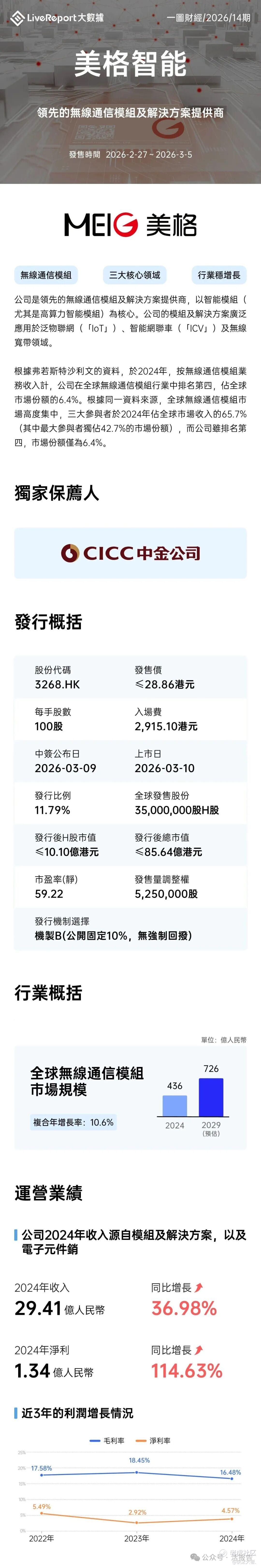 美格智能(3268.HK)招股日期为2026年2月27日至2026年3月5日,并预计于2026年3月10日在港交所挂牌上市。公司于2017年6月在深交所主板上市,股份代码002881.SZ。截至2月27日收盘,公司A股收盘价为49.18元人民币,总市值约为129亿人民币。