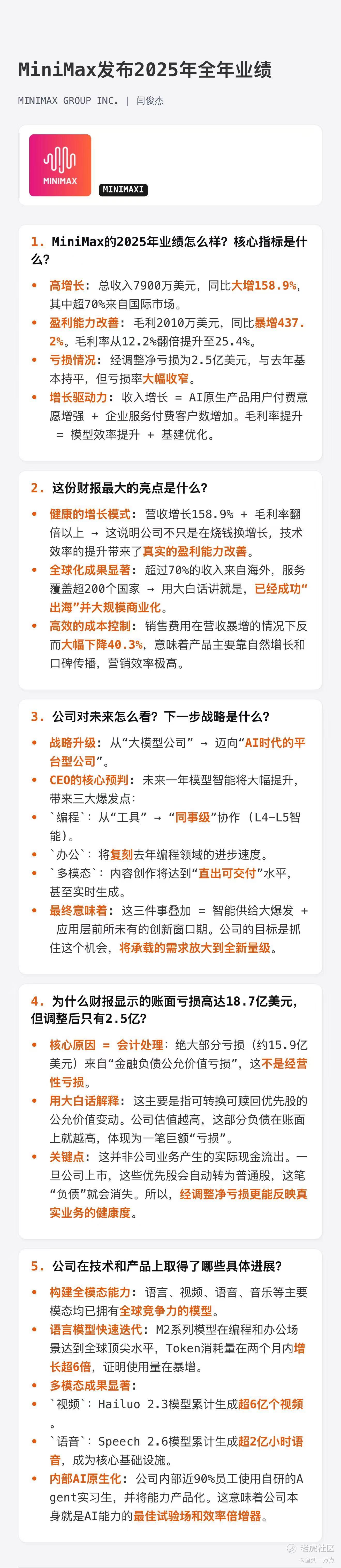 MiniMax这份年报整体看还是挺稳的,收入同比大幅增长,毛利和毛利率也都在往上走,经营层面在持续优化,亏损率也有所收窄,整体商业化效率比之前好不少,长期看还是有看点的。