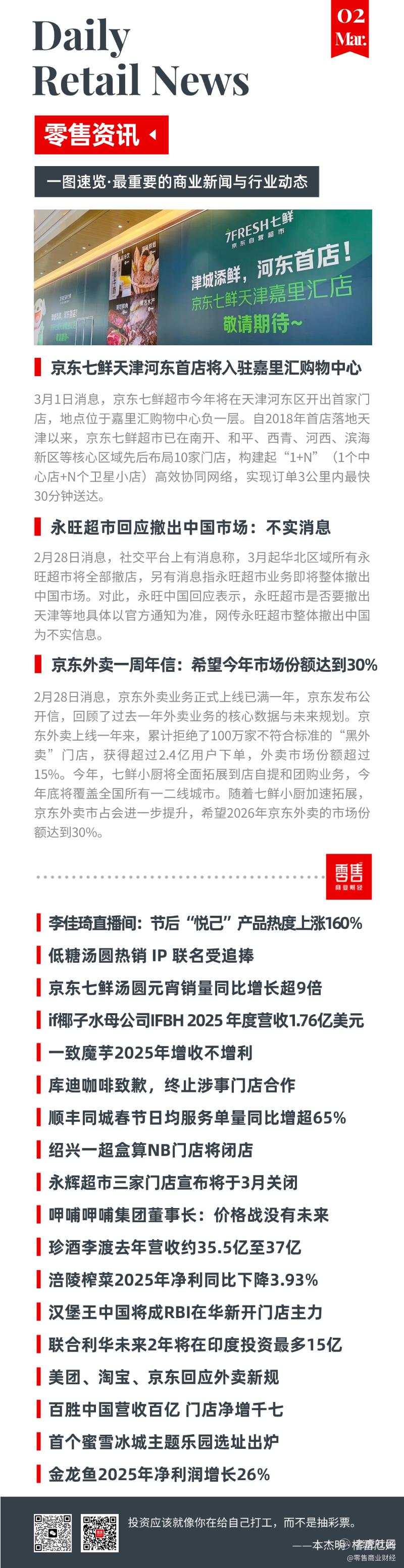 3月1日消息,京东七鲜超市今年将在天津河东区开出首家门店,地点位于嘉里汇购物中心负一层。自2018年首店落地天津以来,京东七鲜超市已在南开、和平、西青、河西、滨海新区等核心区域先后布局10家门店,构建起“1+N”(1个中心店+N个卫星小店)高效协同网络,实现订单3公里内最快30分钟送达。