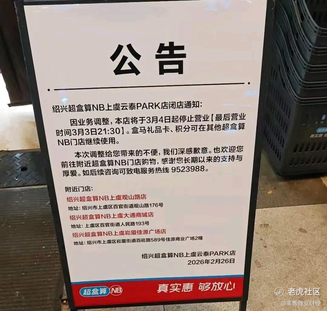 近日,位于绍兴上虞区云泰PARK一层的超盒算NB(原盒马NB)贴出闭店公告称,因业务调整,将于3月4日正式停止营业。公告显示,持有盒马礼品卡和积分的顾客可在上虞其他三家门店(观山路店、大通商城店、崧厦佳源广场店)继续使用。目前,店内商品正在进行最后的清仓处理。据悉,该店于2025年7月25日开业,至今仅半年多时间。虽然地处上虞城北黄金地段,但位置极为特殊——紧邻人气爆棚的万和城,且与对面的新大通盒马鲜生仅相距几百米,竞争异常激烈。有业内人士认为,这并非简单的经营失败,更像是品牌在"试错"后的果断"止损"。(越牛新闻)