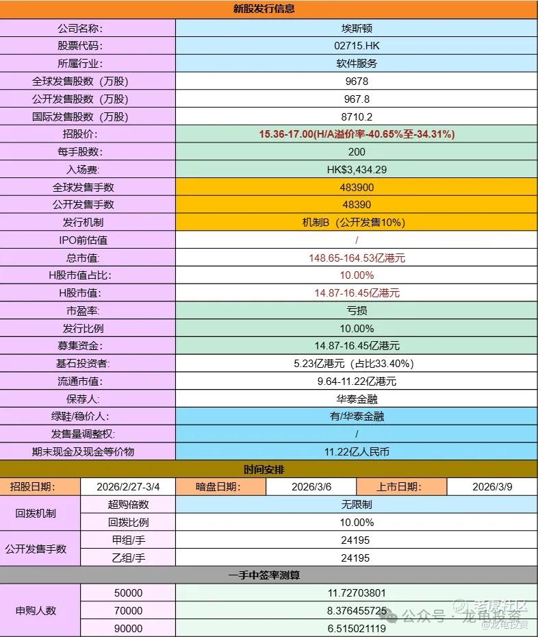 全球发售股数9678万股,每手股数200股,招股价15.36-17.00港元,入场费3434.29港元,采用机制B发行,公开发售手数48390手,预计5-9万人参与,一手中签率8%左右,申购200手稳一手。