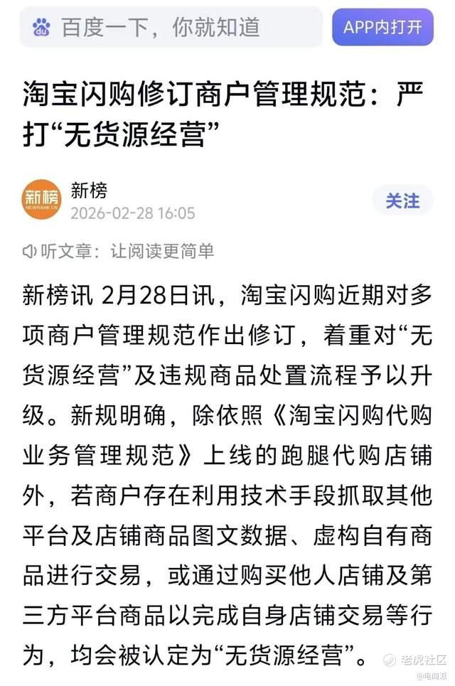 日前,淘宝闪购悄然修订多项商户管理规范,将矛头直指平台生态的“顽疾”——无货源经营。
