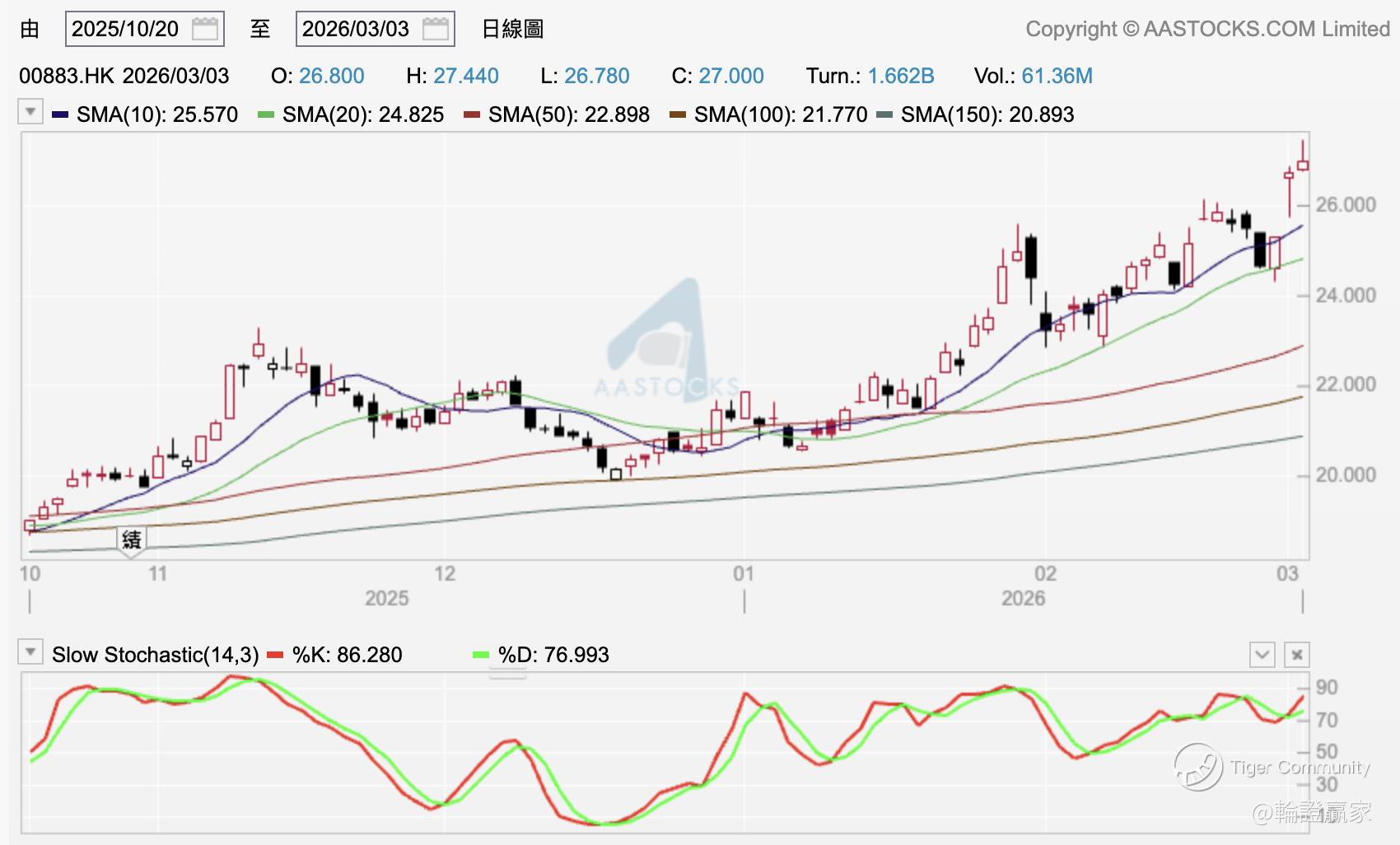 㖊日拣咗只 $UB#CNOOCRC2810B.C(59937)$ 出嚟,主因简单,就系美伊战争不会喺短时间内停火之下,油价被推高,从而拣只主力于上游业务aka受惠于油价较多嘅 $CNOOC(00883)$ 出嚟。