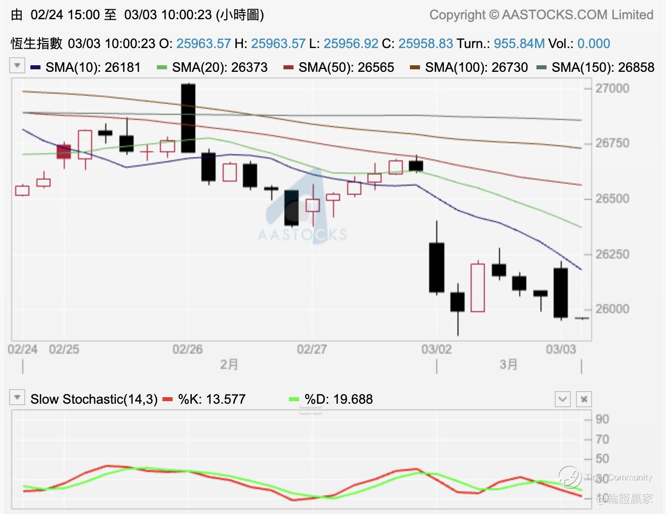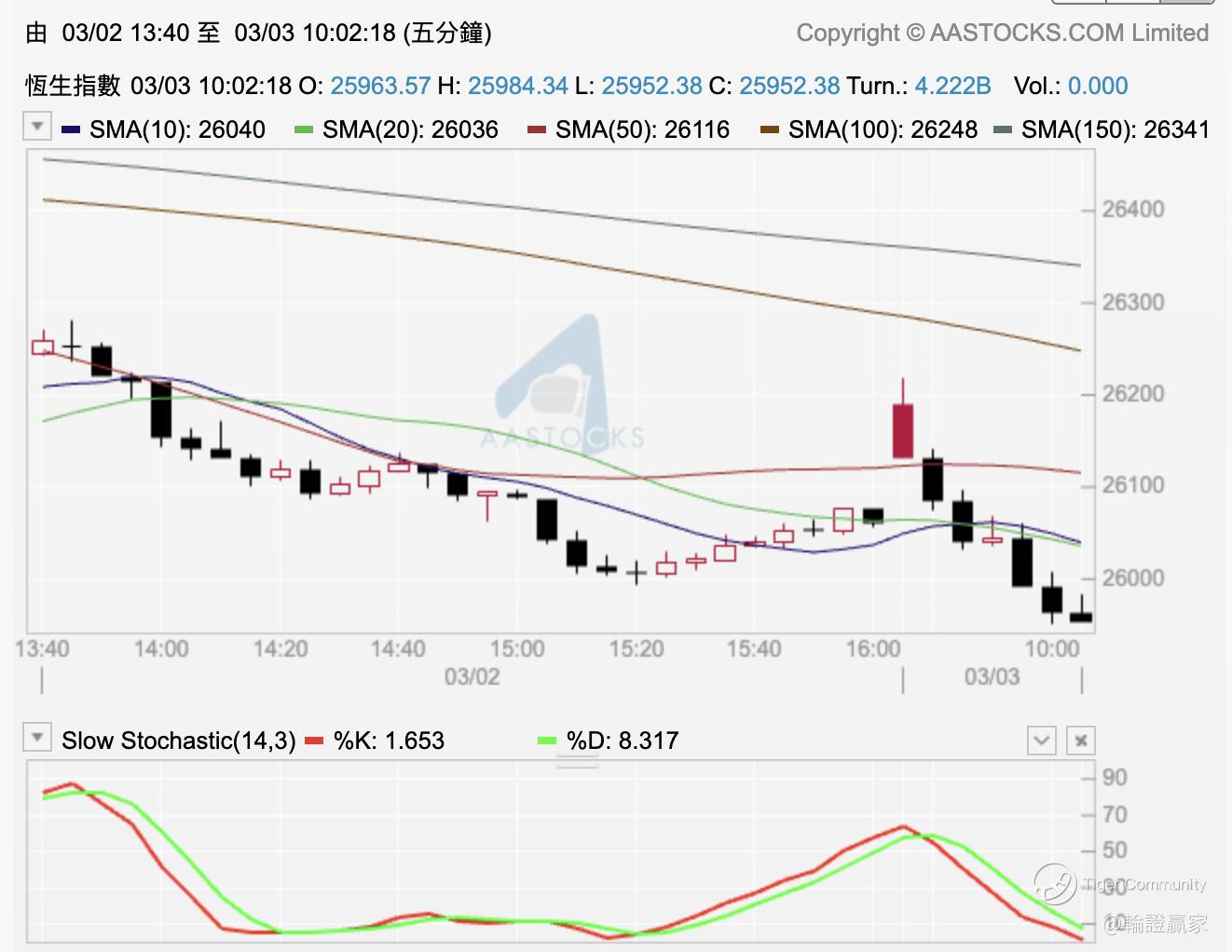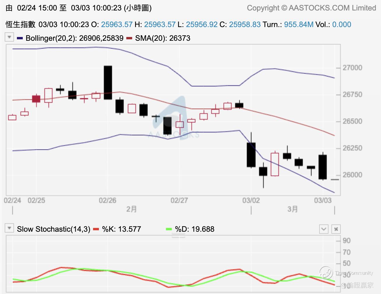 换小时图见指数目前仍然处于10线同保历加底线之间上落,今朝开市口价摆位比较靠近上方10线位,开市后升转跌见落过㖊日下半场嘅低位后,开始有见于26000点似喘定,Slow STC(14.3)两线已经处于超卖位唯仍保持向下。
