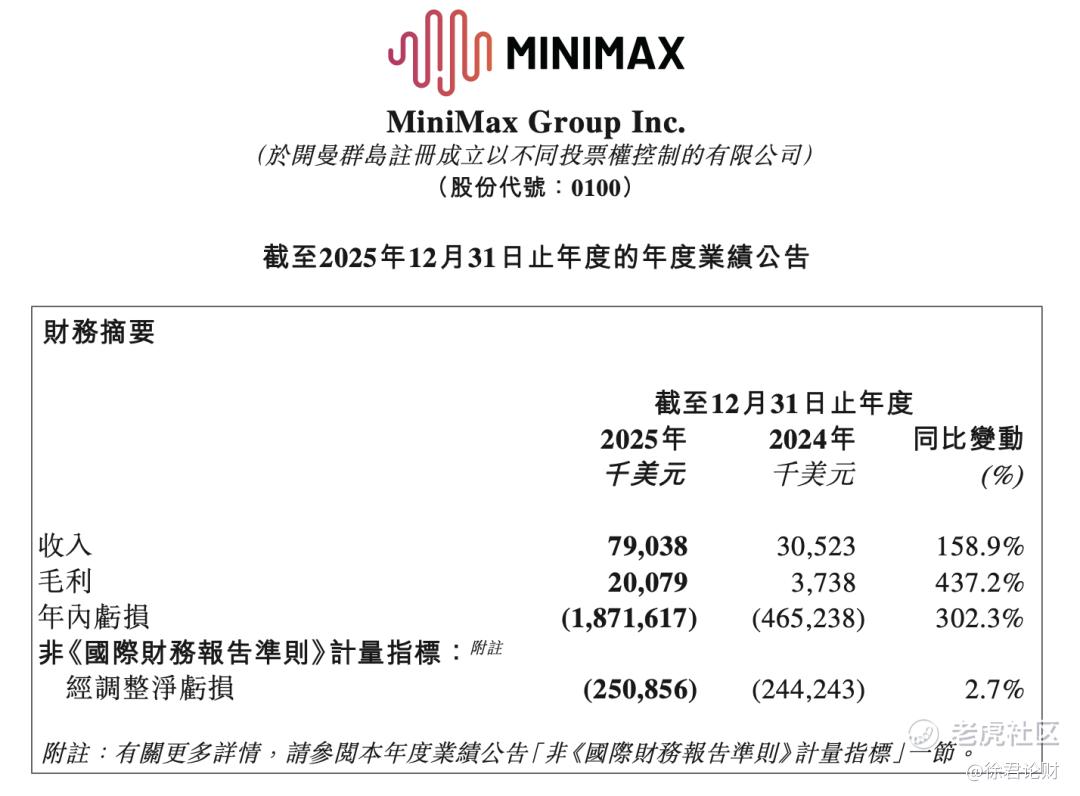3月2日港股收盘后,MiniMax发布了上市以来的首份年度业绩公告。截至2025年12月31日止年度,公司总收入为7904万美元,同比增长158.9%;毛利2008万美元,同比大增437.2%;毛利率从2024年的12.2%提升至25.4%。IFRS口径下年内亏损18.72亿美元,同比扩大302.3%。剔除股份支付费用、金融负债公允价值亏损及上市开支后,经调整净亏损为2.51亿美元,较上年的2.44亿美元微增2.7%,核心经营亏损已基本企稳。