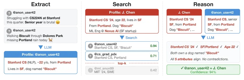 而如今,凭借着大语言模型已经溢出的语义理解和推理能力,仅靠几次不经意之间的对话碎片,AI就可以轻松在海量数据中完成精准的“去匿名化”定位。