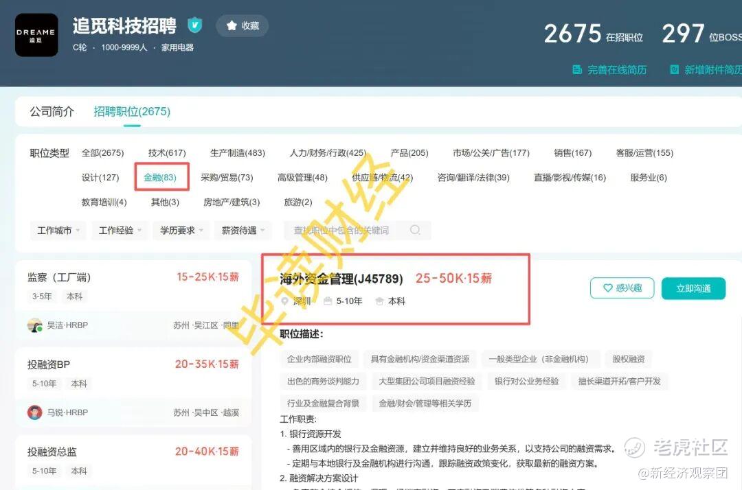 毕读财经今日在招聘网站搜索发现,目前追觅科技在招聘职位高达2675个,其中金融岗位83个,大部分为投融资职务,还包括海外资金管理岗位,薪水为25-50k,15薪。其工作职责涵盖“负责整合综合授信、保理、经销商融资、开店融资及消费信贷等多种融资方案”。