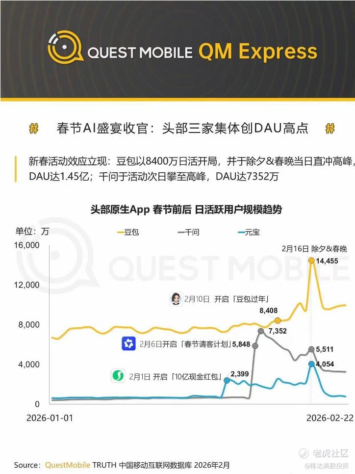 最嗲的地方是根据QuestMobile,春节期间千问日活(DAU)创下历史新高,春节峰值DAU达到7352万,以DAU 940%涨幅拿下春节头部AI应用最大涨幅,首日用户使用次数也为最高。阿里的大模型之前toC是接入夸克(数据也一直不错),所以这次千问的toC几乎实现从无到有的爆发,拿到了种子用户,并迅速收窄与头部的gap。而所谓路漫漫其修远兮,就是要看后续用户的留存情况,用户粘性与LTV.。