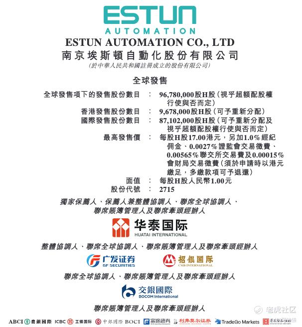 埃斯顿采用机制B,回拨10%;全球发售9678万股,香港发售967.8万股,一手是200股,共计48390手;甲尾申购需要34万本金,乙头申购需要52万本金;优乐赛共享、兆威机电、埃斯顿、美格智能这4个新股存在资金冲突;现在倍数是12倍了,预计最终会在100倍左右;华泰独家保荐,有基石,有绿鞋,历史保荐项目比较一般。
