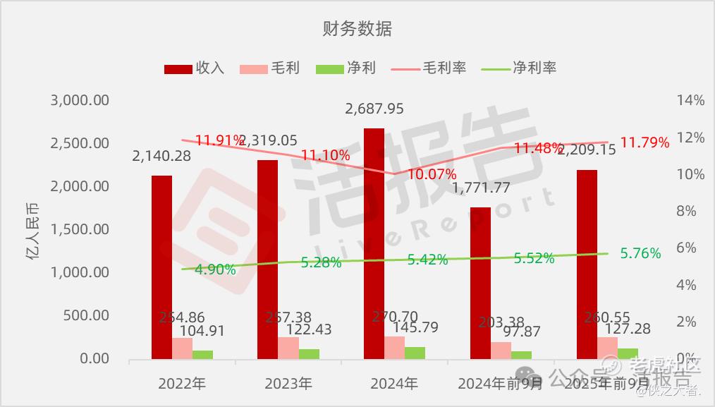毛利分别约为人民币254.86亿、257.38亿、270.70亿、203.38亿、260.55亿,2025年前9月同比+28.11%;