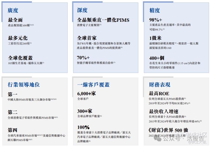 根据弗若斯特沙利文的资料,按2024年收入计,公司在精密智造解决方案(PIMS)行业中排名全球第四、中国大陆第一,并在消费电子、汽车电子、通信与数据中心等各主要业务线均处于全球领先地位;在全球精密智造解决方案提供商中,公司拥有最全面及最多元化的产品组合。公司于2023年至2025年连续三年跻身《财富》世界500强榜单。