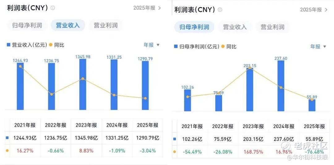但从全年来看,总营收1291亿元,同比略有3%的下滑。