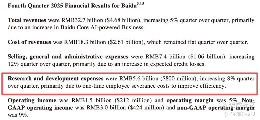 财报显示,四季度百度研发费用达56亿元,环比增长8%,而这一增长的核心原因,并非传统研发投入的增加,而是公司支付的一次性员工遣散费用。