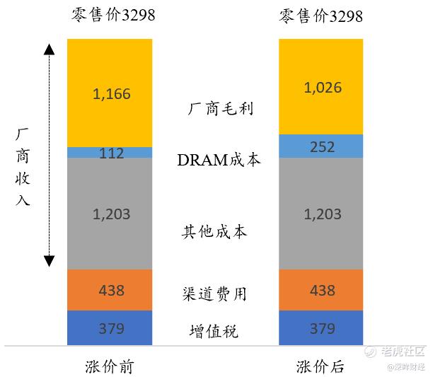 注2:①京东零售价3298元;不含增值税零售价3298/1.13=2919元;扣除15%的渠道佣金2919*0.85=2481元;②销售一台厂商确认收入=2481元;2片2GB涨价金额(从8美元涨到18美元) = 2* (18 - 8 )* 7 = 140元;③对毛利率影响140/2481=5.64%。