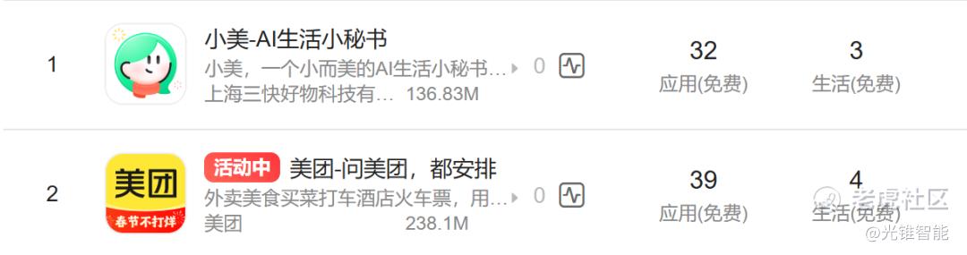直到在元宵节,小美上线了限时3天给新注册用户发放大额优惠券的福利活动。靠着福利,小美闯进了App Store的第33名、生活榜单第三名。但和上述AI入口相比,美团还难以摸到和众多大厂竞技的标准线。