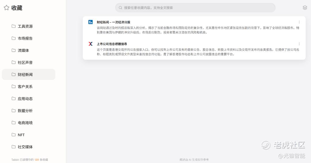 在笔者导入原来Chrome数据,并调用Tabbit的标签页/收藏夹智能分组功能后,它用了几分钟,帮我把一百多个网址分类放进科技报道、财经信息、市场报告等十几个收藏夹中,点开每个收藏夹,还能看到AI对各个网页的信息作出解析,方便用户按需查找。