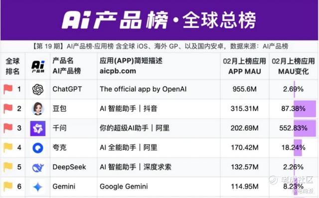 3月3日,AI产品榜发布最新全球AI应用数据。千问以2.03亿月活用户,成为全球第三大AI应用,仅次于ChatGPT和豆包。同时,千问也以552%的增速居全球第一。