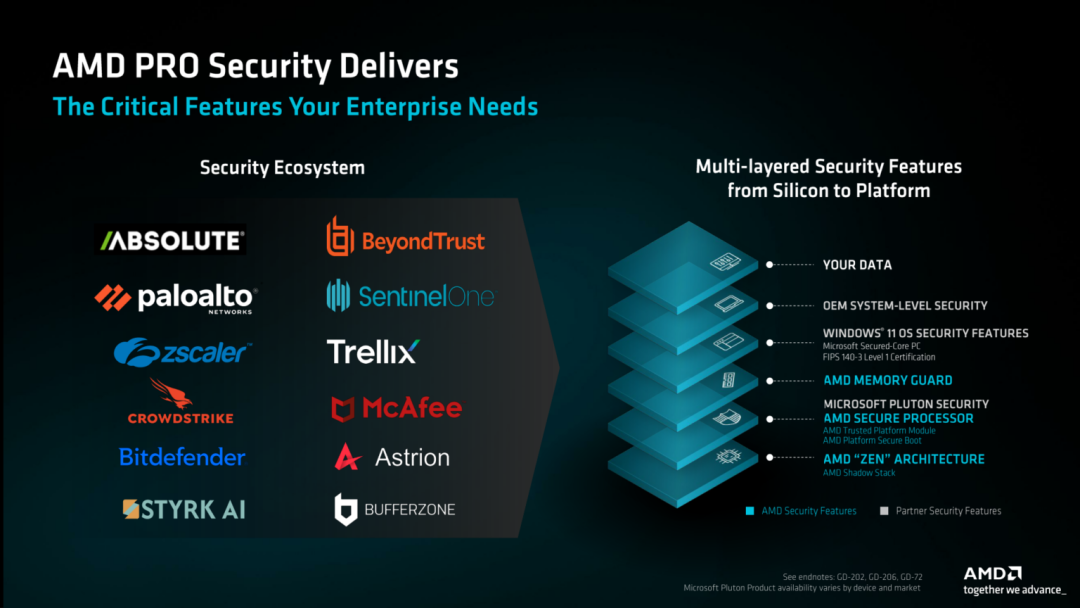 ◎ 安全性方面,从硅芯片到平台的多层防护,包括AMD Memory Guard内存加密、硬件信任根等,直接对标英特尔vPro。