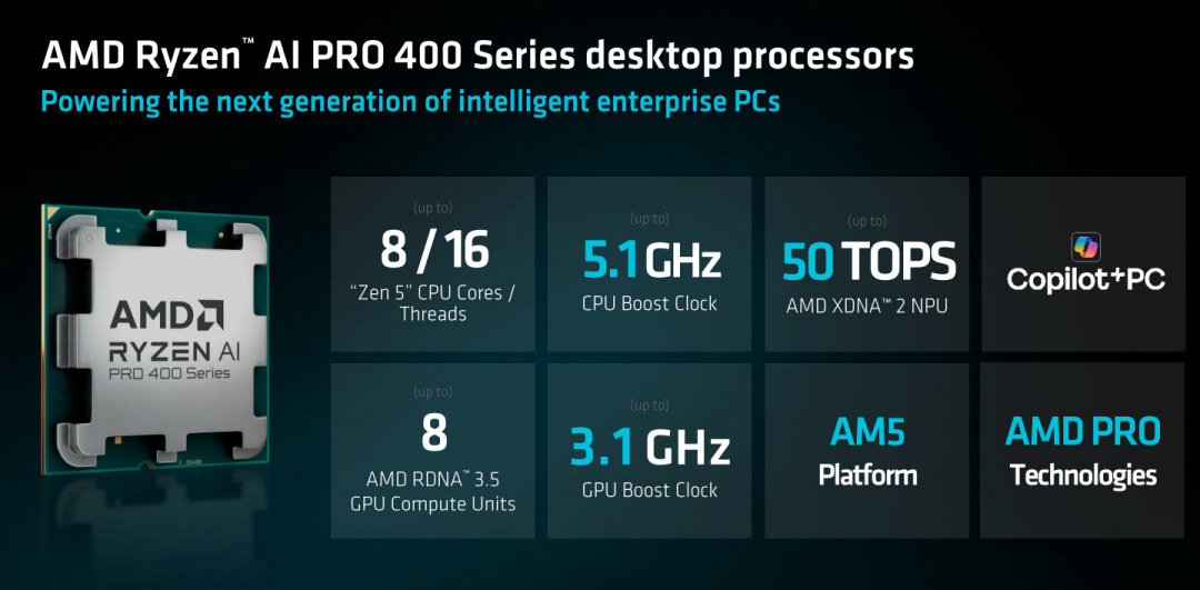 锐龙AI PRO 400台式机处理器,桌面版的发布是本次最值得关注的动作之一,这是AMD首次将XDNA 2 NPU引入AM5桌面平台。