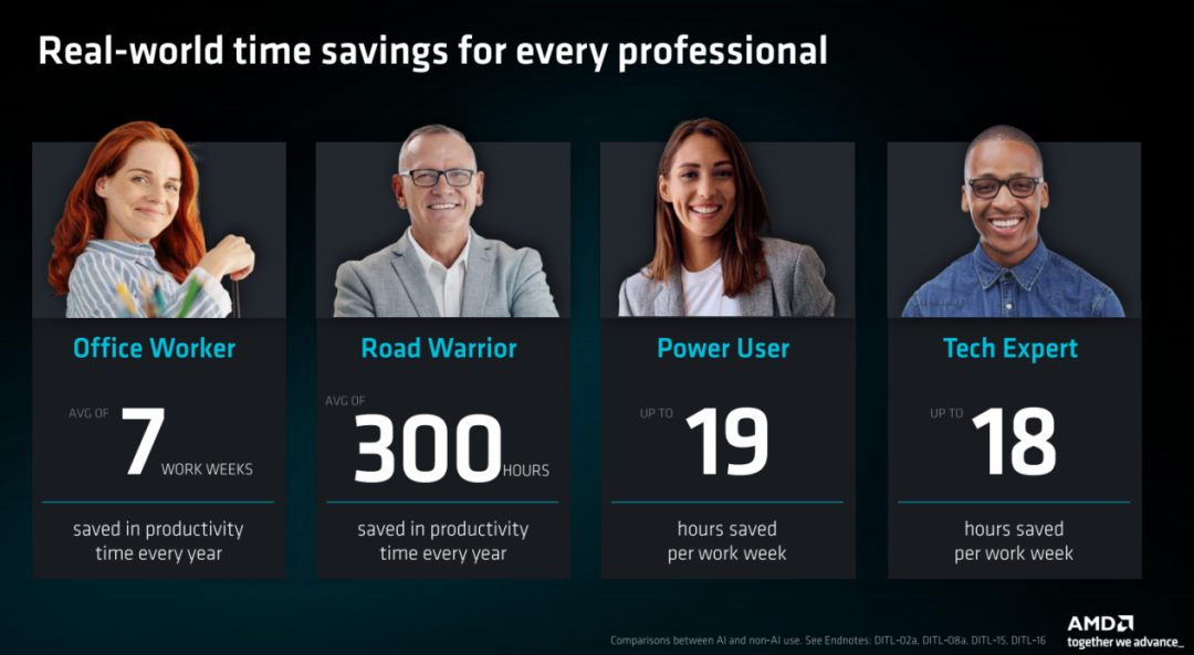AMD 目前的产品逻辑主要是针对白领打工人的,办公室白领每年节省7周工作时间,商务人士每年节省300小时,高性能用户每周节省19小时,技术专家每周节省18小时。