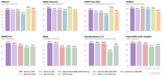 Qwen3.5-9B,参数量90亿,它在GPQA Diamond上的得分是81.7。作为对比,ChatGPT有一个开源模型,参数量1200亿,得分差不多。