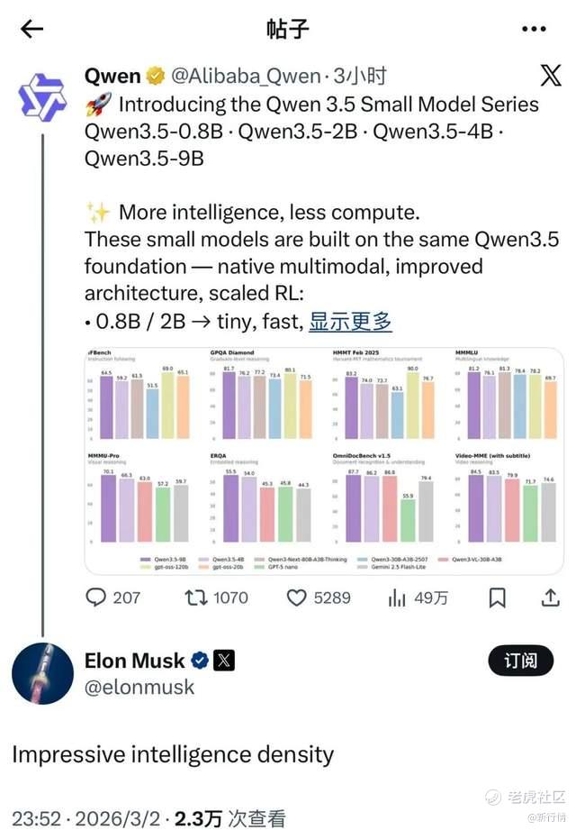 发完没多久,马斯克突然出现在评论区,毫不吝啬地留下一句“Impressive intelligence density(令人印象深刻的智能密度)”。