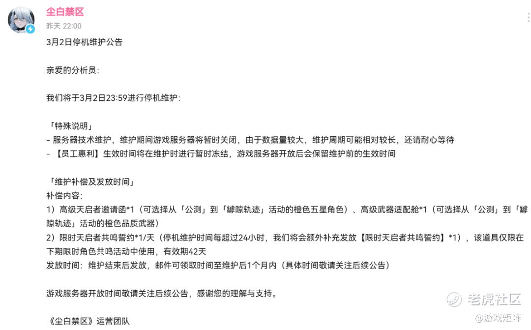 3月2日晚间,靴子落地。《尘白禁区》官方在B站发布了这次的没有预告时长,没有常规的版本号,只有一句“服务器技术维护” 的“紧急停服维护公告”。