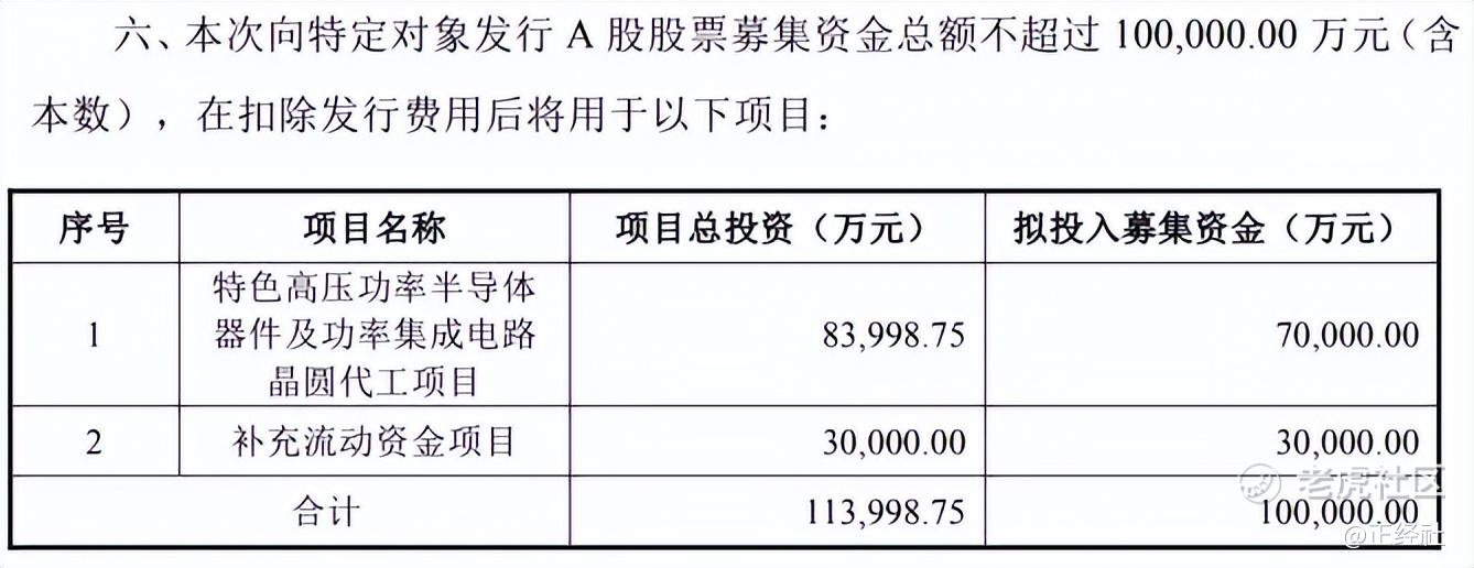 本次10亿元定增,资金去向十分集中:7亿元投向特色高压功率半导体器件及功率集成电路晶圆代工项目,3亿元用于补充流动资金。