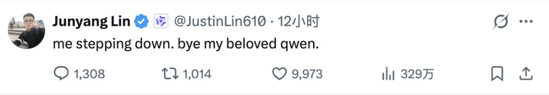 “me stepping down. bye my beloved qwen.(我将卸任。再见,我亲爱的Qwen。)”