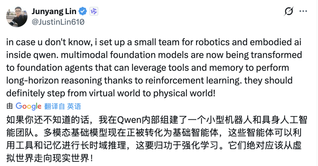 2025年10月,林俊旸更是在X平台上雄心勃勃地宣布,已在Qwen体系下组建了全新的“机器人与具身智能”极客小分队,让多模态模型从虚拟数据世界真正迈向物理交互世界。