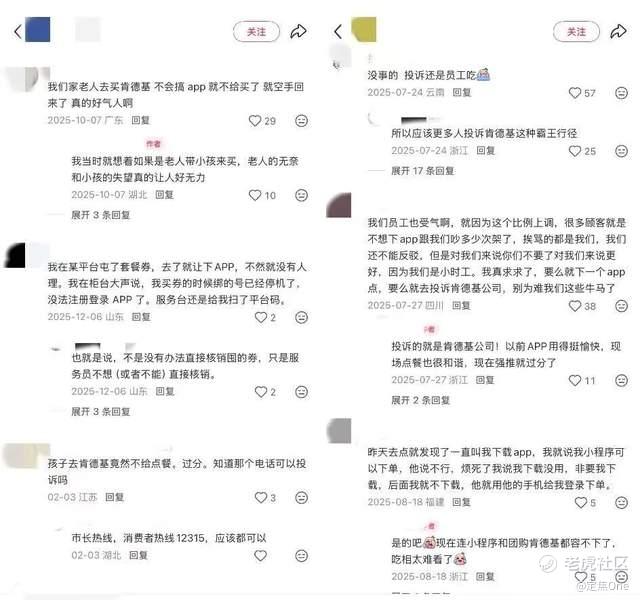 在社交平台,类似的讨论并不少见。一些消费者分享过被引导甚至强制下载APP的经历,甚至社交平台上有自称是肯德基店员的用户直言:不用APP,肯德基就宁可不赚这一单的钱。
