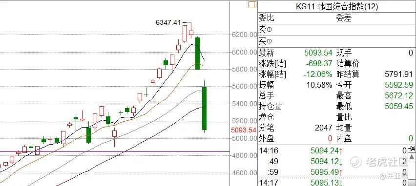 如上图所示,坏消息是,这几天整个全球股市都受到了中东战事的外溢冲击,韩国股市今天收跌12.06%,你们可以看一下日K线图,感受一下那种断崖式跳水的恐怖。