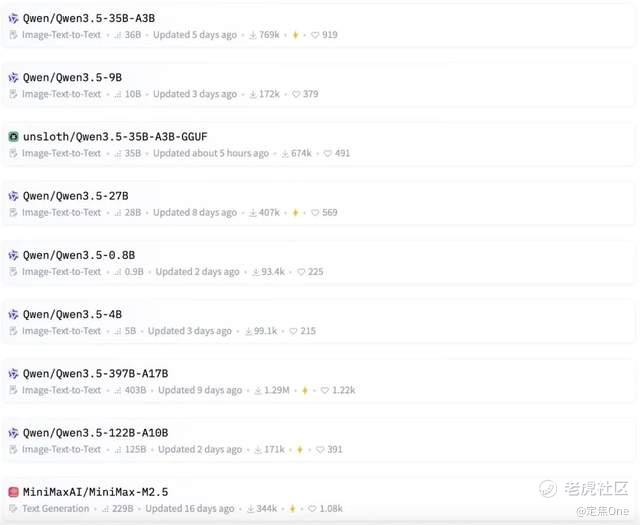 在开源社区,Qwen3.5系列四款开源小模型(Qwen3.5-0.8B、2B、4B、9B)表现亮眼,上线后不仅获得马斯克的点赞,也在AI开源社区与模型托管平台Hugging Face上热度飙升,包揽趋势榜单前8位。