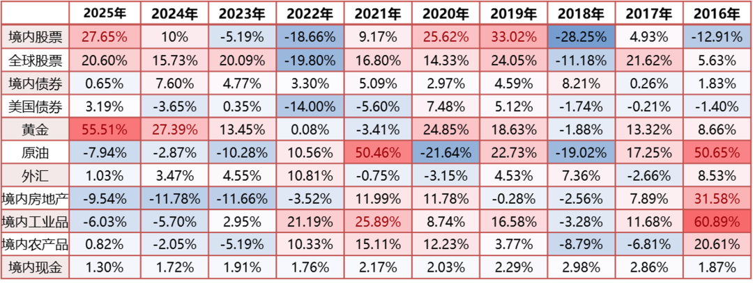 数据来源:wind;统计时间为 2016-2025年。各类资产选取的指数:境内股票为万得全A指数、全球股票为MSCI全球指数、境内债券为中债新综合财富(总值)指数、美国债券为CBOT10年美债;黄金为COMEX黄金、原油为ICE布伦特原油、外汇为万得外汇投资指数、房地产为万得一线城市房地产投资指数、工业品为南华工业品指数、农产品为南华农产品指数、现金为万得货币市场基金指数。