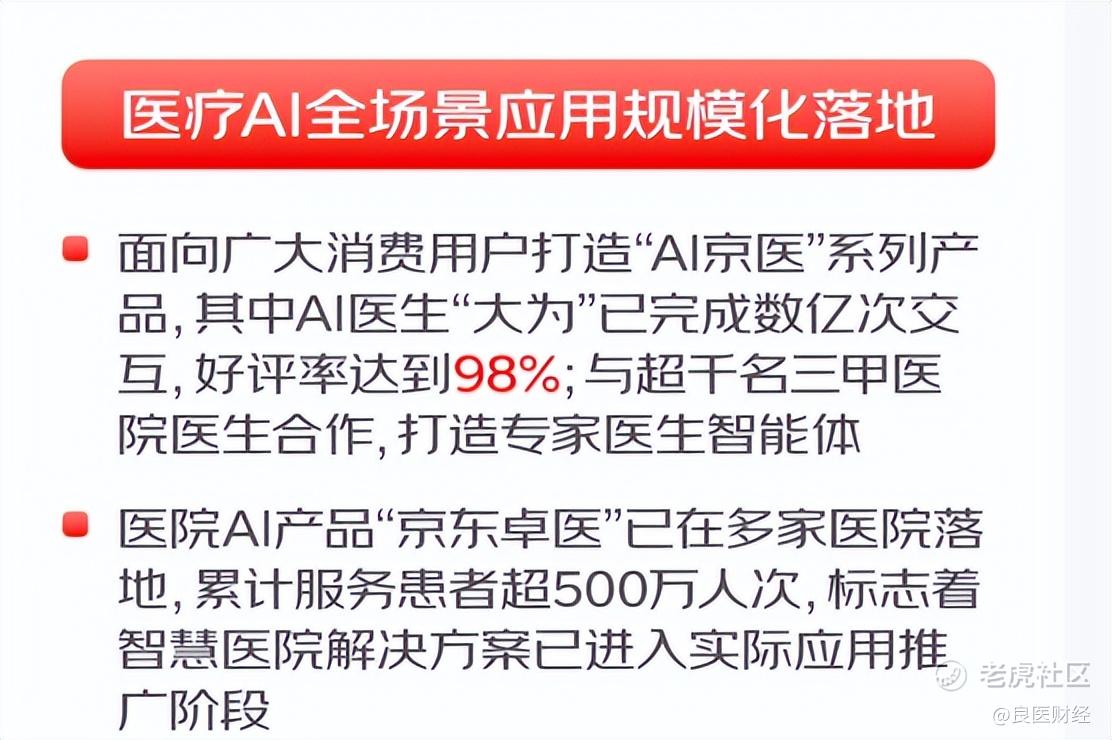 2025年以来,京东健康积极响应国家发展健康消费领域的新质生产力的号召,以“AI+供应链”,打通了从线上到线下、从院内到院外的服务闭环,面向用户、医生及医院,推出“AI京医”和“京东卓医”等产品,构建了业内最完整的AI健康服务矩阵。