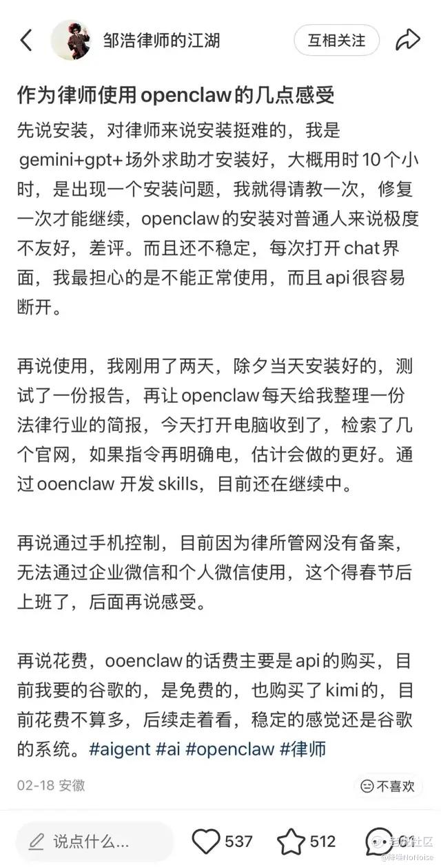 《降噪NoNoise》近日访谈了多名来自不同行业的深度使用者——从技术极客到传统行业的AI尝鲜者,试图回答一个问题:对于普通人而言,OpenClaw是场短暂的产品狂欢,还是值得长期氪金的AI助手?