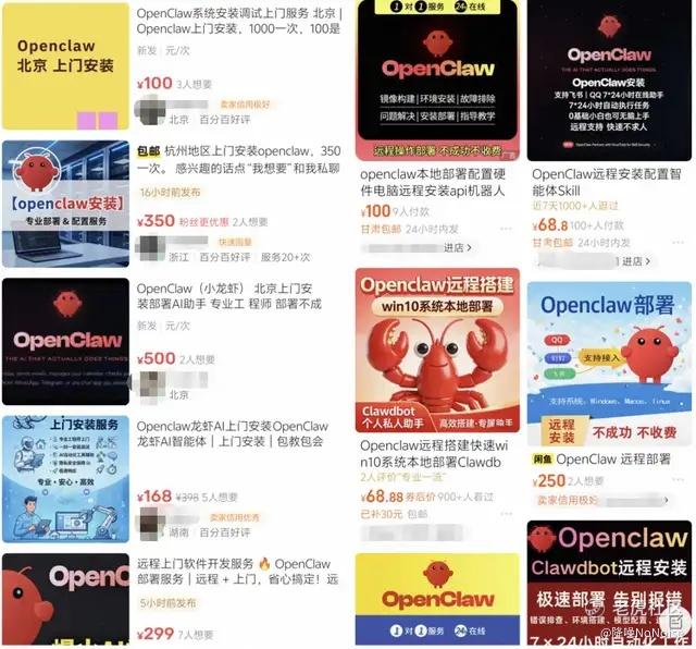 本地部署的门槛再高,也压不住用户的热情。电商平台上,售价198元到566元的远程安装服务,销量已破900+,成为继安装DeepSeek之后的又一热门服务。闲鱼和小红书上,OpenClaw上门安装的报价从几十元至几千元不等。