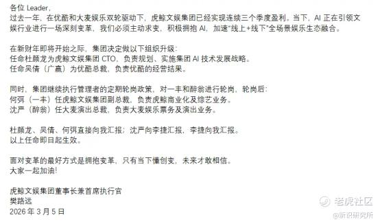 此次人事调整涉及技术、内容、演出等多个核心业务板块,显示出虎鲸文娱在AI技术驱动下的战略布局正在加速落地。樊路远在邮件中表示:“AI正在引领文娱行业进行一场深刻变革。面对变革的最好方式是拥抱变革,只有当下懂创变,未来才敢相信。”