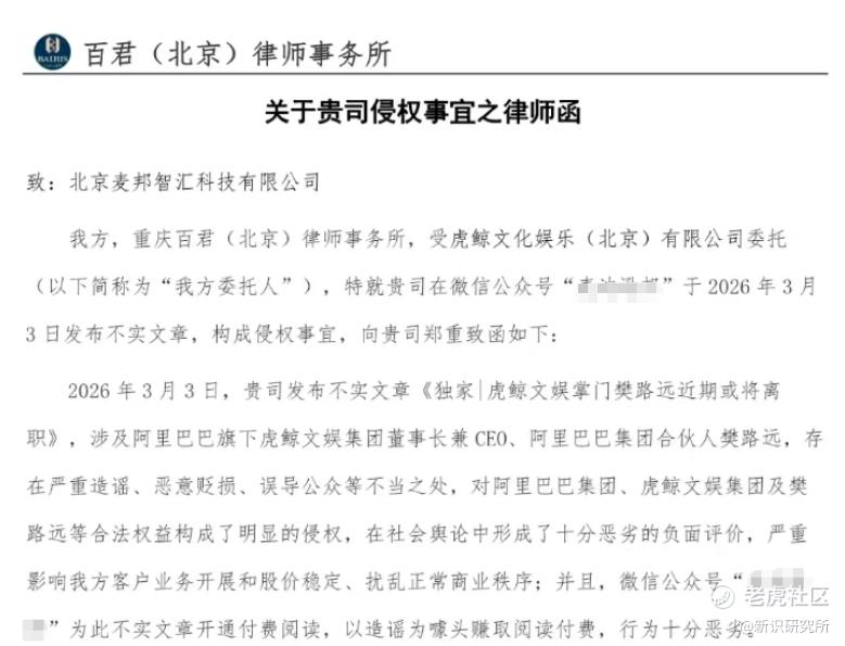 此前,网传虎鲸文娱掌门樊路远近期或将离职,而据相关截图显示,虎鲸文娱已经对其发送律师函,称其发布不实文章,构成侵权事宜。