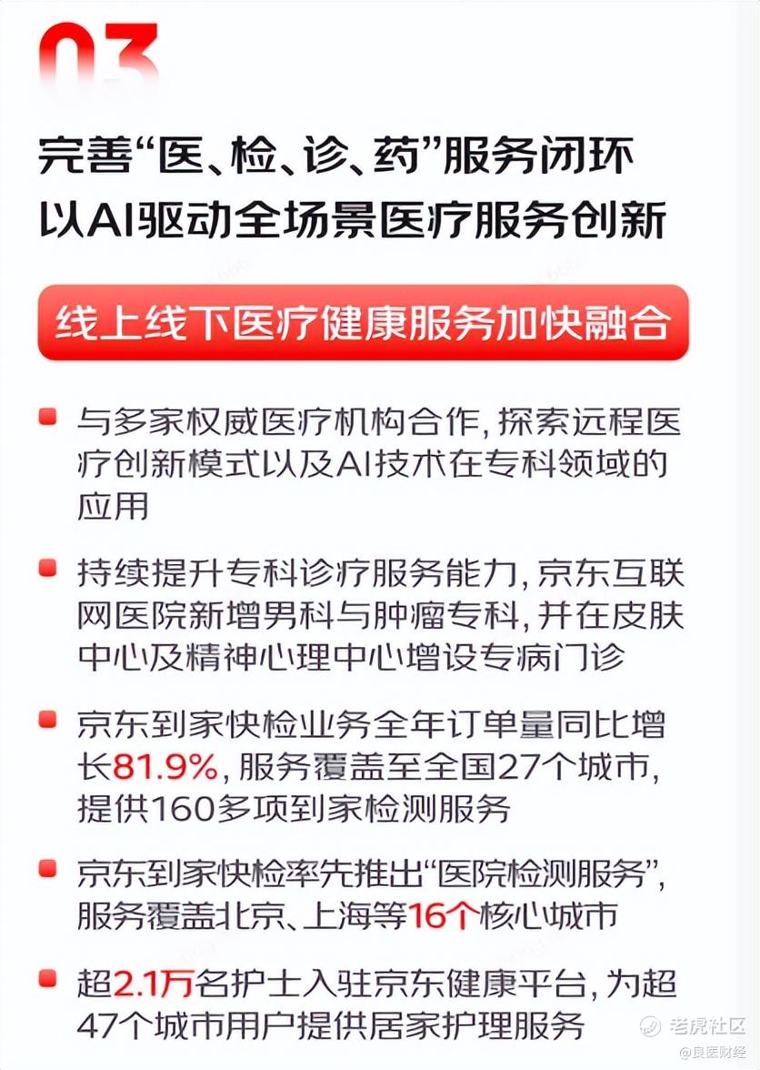 2025年,京东健康持续完善“医-检-诊-药”全流程服务闭环,加速线上线下医疗健康服务融合,打造更专业、更高效的全场景健康服务体系,让用户足不出户就能获得“医生线上看”、“检查在家做”、“药品送到家”、“护理到家做”的一站式医疗健康服务。