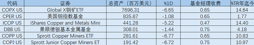 受此影响,昨夜铜矿etf大跌,其中, $铜矿ETF-Global X(COPX)$ 单日下跌 6.65%, $Sprott Copper Miners ETF(COPP)$ 下跌 6.77%, $SPROTT JUNIOR COPPER MINERS ETF(COPJ)$ 下跌 6.72%,跌幅均接近7%,反映铜矿企业股价对铜价波动更加敏感;而跟踪铜期货价格的 $美国铜指数基金(CPER)$ 跌幅相对较小,单日下跌 1.08%,显示矿业股ETF的波动通常明显高于商品本身。