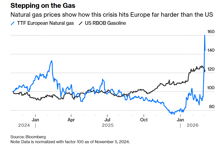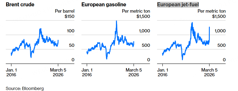 而且据我们观察,虽然美伊这摊战争的浑水目前是越搅越浑,美以和伊之间的大战也是打的越来越起劲,战争过去7天了,我竟看不出来谁有稍落下峰的迹象。但即便如此,能源市场上的情绪是仍然没有失控,大家看下,除了原油的走势有小幅上涨外,欧洲的汽油涨幅也一般,就燃油有大幅90度拉升的迹象