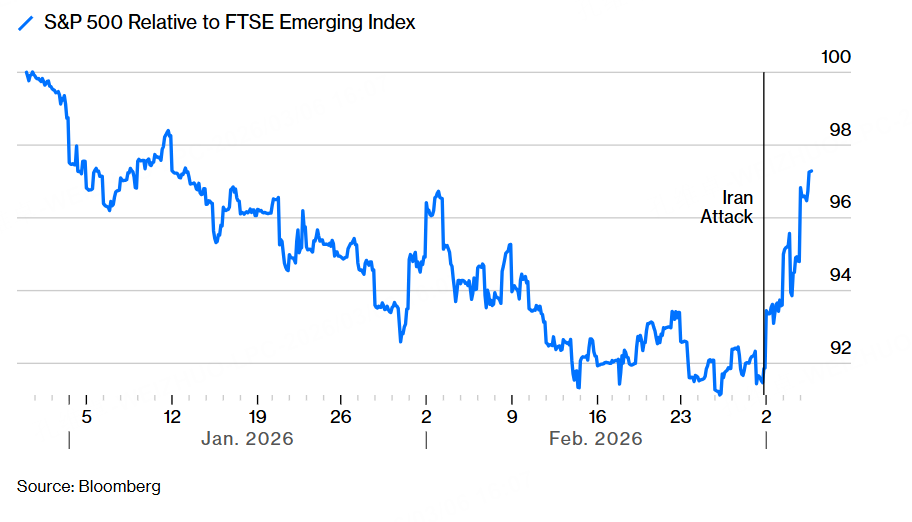 随着战争的开打,市场资金居然还抛售了大量的新兴市场股票来追逐美股,让美股相对新兴市场的股票的涨幅又回来了