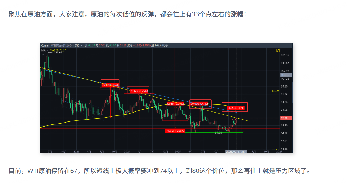 最重要的是,目前WTI原油已经涨破了之前我说的季节性规律上的33%的整体涨幅,这个涨幅目前已经达到,我在上次分享时就跟大家说过74到80是高压区域,再往上,就会有抛压产生,所以短期的上行利润建议可以用买近卖远的牛市价差套利来吃。