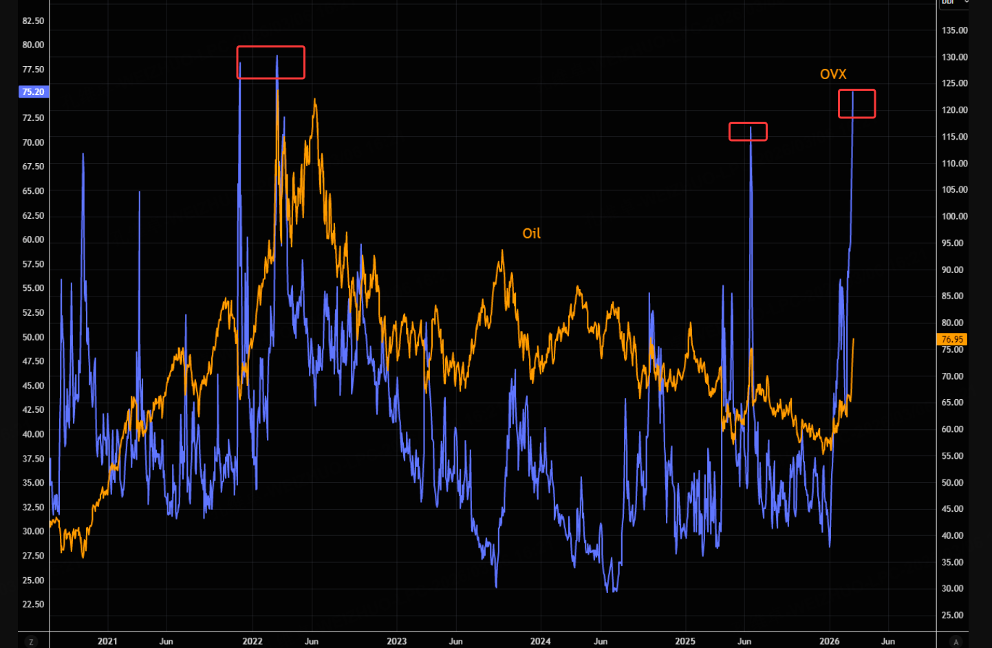 更何况,就短期而言,美原油的VIX值已经来到了历史高点上,不值得再继续押注向上: