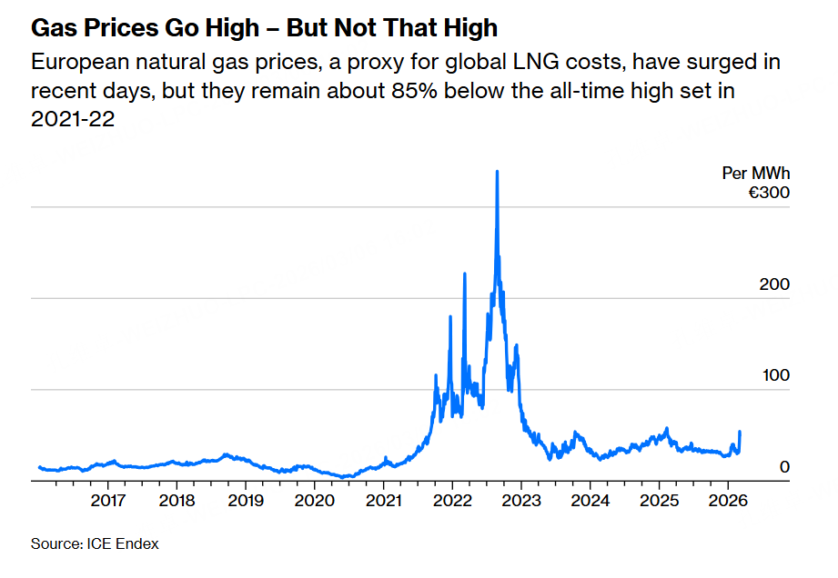 其次,欧洲的天然气价格也比较平淡,没啥太大的反应,和之前2021到2022年相比差远了。