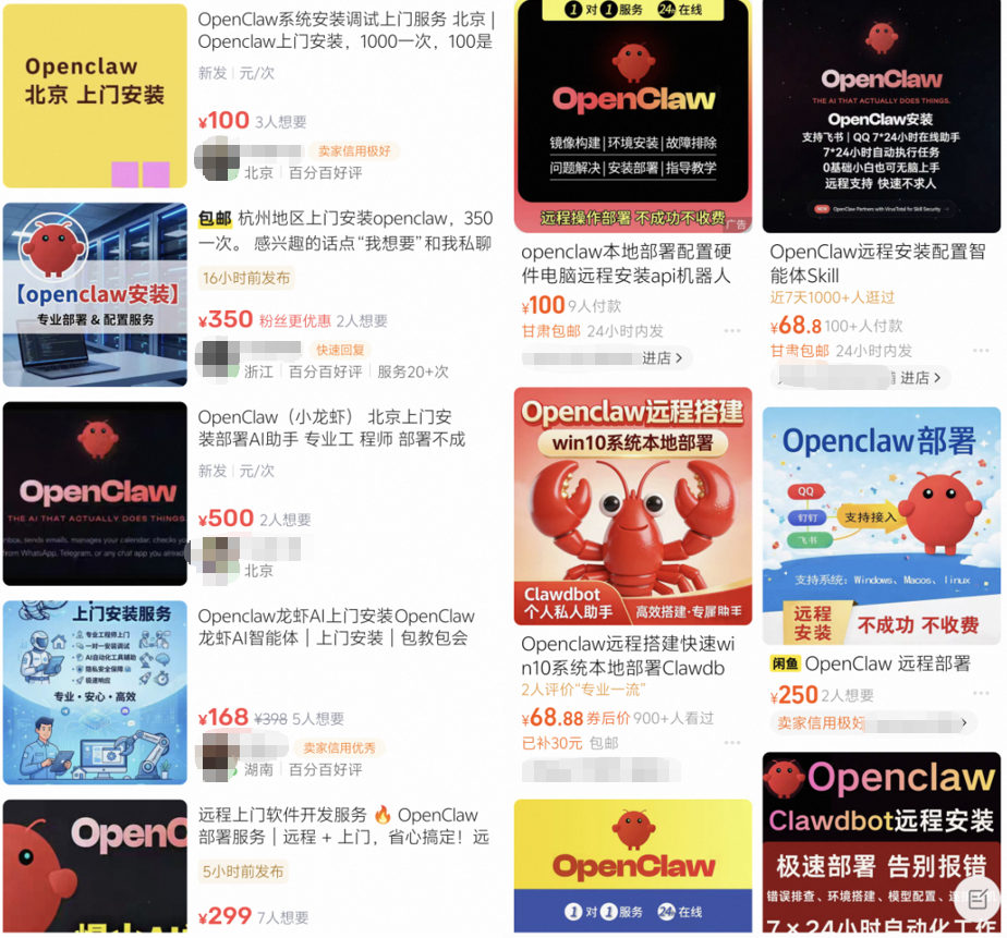 本地部署的门槛再高,也压不住用户的热情。电商平台上,售价198元到566元的远程安装服务,销量已破900+,成为继安装DeepSeek之后的又一热门服务。闲鱼和小红书上,OpenClaw上门安装的报价从几十元至几千元不等。