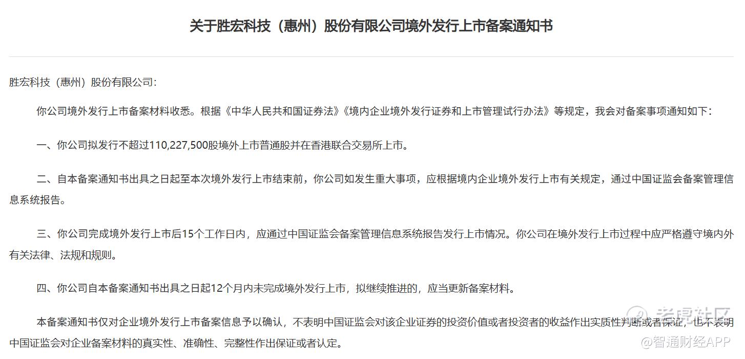 智通财经APP获悉,3月6日,中国证监会国际合作司发布《关于胜宏科技(惠州)股份有限公司境外发行上市备案通知书》。胜宏科技(300476.SZ) $胜宏科技(300476)$ 拟发行不超过110,227,500股境外上市普通股并在香港联合交易所上市。